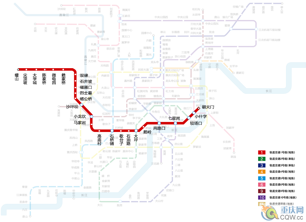 重慶軌道交通1號線東起朝天門,西至尖頂坡,采用鋼輪鋼軌地鐵制式。該線路是軌道交通線網東西方向的主干線,也是貫穿渝中區、九龍坡區和沙坪壩區的重要交通線路。