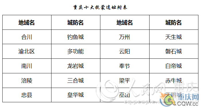 十大抗蒙遺址大體沿兩江兩岸分布,其中釣魚城、天生城、磐石城等保護較好,歷史價值高。其中,最濃墨重彩的是釣魚城。