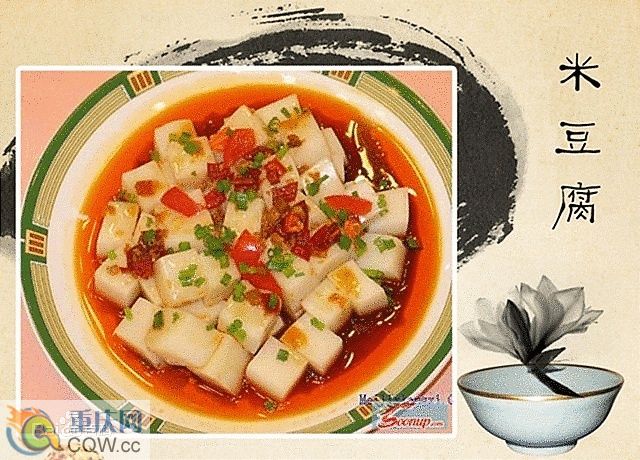此菜潤滑鮮嫩、酸辣可口。它是用大米淘洗浸泡后加水磨成米漿,然后加堿熬制,冷卻,形成塊狀“豆腐”即成。食用時切成小片放入涼水中再撈出,盛入容器后,將切好的大頭菜、鹽菜、酥黃豆、酥花生、蔥花等適合個人味口的不同佐料末與湯汁放于米豆腐上即可。