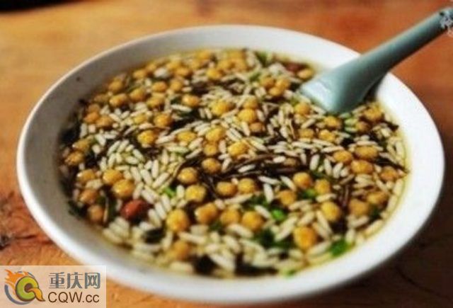 這是土家族的特色飲食,其來源有兩種說法:一是漢代曾在酉陽駐軍的伏波將軍馬援,因當地多瘴威脅士兵身體健康,遂用合茗葉、茱萸、芝麻、鹽巴研末為湯飲用(取名五味湯),其后百姓仿效烹制,這才逐漸演變成獨具風味的油茶湯;另一種說法源于土家族先民巴人。
