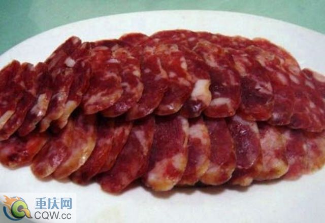 鮮豬肉用溫水洗凈,瘦肉切成胡豆粒大小的肉丁,肥肉粒約為瘦粒的一半大,然后加料拌腌。在肉料中加入食鹽、白酒、花椒粉、姜粉及其它香料,拌勻。即可灌入選好、洗凈的豬腸衣內。灌餡時要用針刺腸衣,以排出空氣,每12至15厘米扎1個節。灌好的香腸,用溫水洗凈,掛在竹桿上,上火炕烘烤兩天。烘烤時,要適時翻動,炕溫保持在600C左右,防止跑油。加工好的香腸,應為腸身干爽,結實有彈性,瘦肉色澤鮮紅或暗紅色,肥肉色澤乳白而呈透明狀。成品紅白分明,鮮美爽口,佐餐下酒皆宜。