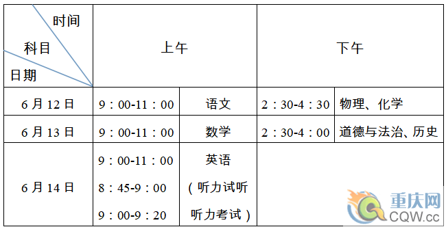 各學科考試范圍以重慶市教科院編制、重慶市教育委員會審定的《重慶市2019年初中畢業生學業水平暨高中招生考試說明》為準,各科命題難度保持穩定。語文、數學、英語、物理、化學試題2/3按水平考試要求命題,1/3按選拔考試要求命題;道德與法治、歷史按水平考試要求命題。