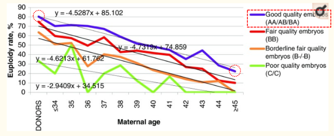 - 但大家注意看一下≥45歲的女性,優質胚胎(AA/AB/BA)中的整倍體率跨度最大,從最高80.30%降至22.22%。