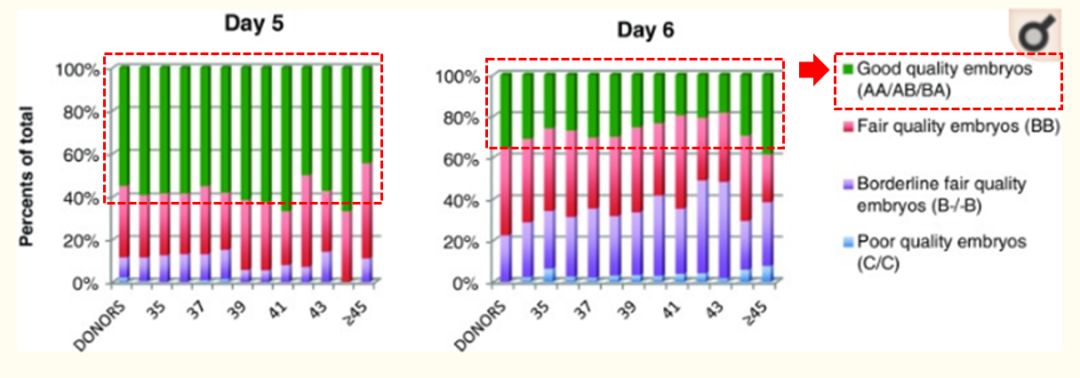 從上圖可以明確看出,在所有年齡組中,第5天胚胎活檢中有一半以上符合優質胚胎的標準(AA/AB/BA)。但是,在第6天進行活檢的胚胎中,被定為優質胚胎的數量明顯減少。