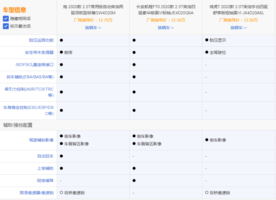 談配置絕對不可以脫離價格,我們選擇三款車型中價格相近的配置進行對比可以發現,域虎7缺失了關乎安全的操控輔助系統,這是不能接受的。長城炮與長安凱程F70在配置上十分接近,更便宜的長安凱程F70反而帶有陡坡緩降功能,明顯是比自動駐車更實用的越野配置。更值得一提的是,長安凱程F70的高配版搭載了長安最新智能車載互聯in-Call3.0系統及360°3D高清全息影像,能夠大大提高用車時的便利性和舒適性。還有前后駐車雷達、定速巡航、徒坡緩降、上坡輔助等功能,大家在選購時可以進行直觀的參數對比。