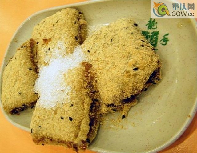 3、糍粑放在案板上晾涼后,分成兩半,一半放在撒有黃豆粉的案板上,攤開壓平成片,將“洗沙”均勻地抹上。將另一半糍粑成大小、厚薄差不多的片,蓋在其上,再把芝麻糖撒在面上,切成塊就可以了。