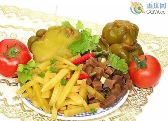 以青菜頭為原料,這種青菜頭有肥大、柔嫩、多汁的瘤狀莖、俗稱菜頭。其加工方法為精選質嫩、形好、新鮮的青菜頭,經剝皮、穿串、晾曬、腌制、上囤、再腌制、壓榨、修剪、挑筋、整形、分級、淘洗、拌料、裝壇、封口等工序制成。修剪整形,濾凈鹽水,然后拌以食鹽、上等海椒面、砂仁、白胡椒、八角、山奈、茴香、甘草、姜干、花椒等多種名貴植物香料粉,入陶壇密封發酵。產品色澤青綠,辣粉鮮紅,塊形均勻,質地脆嫩,香味濃郁,咸淡適口,下鍋不軟,久貯愈香。營養價值甚高。有助消化、解油膩、增食欲的功效。