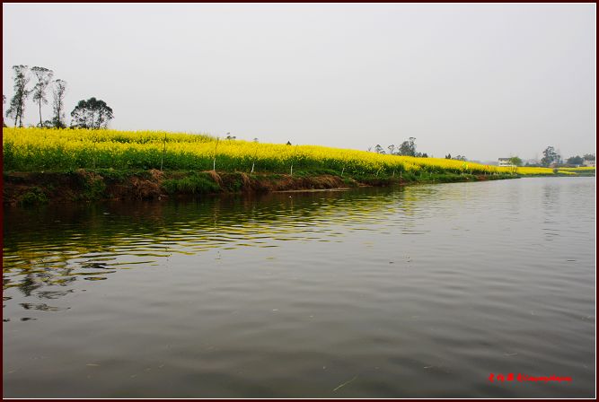 我們在油菜花地里瞎游瞎覽了一個多小時,來到了白沙村水碼頭,從這兒乘船沿河而下繼續欣賞油菜花兒。這就是水上觀光的線路。乘船觀光不是一站直達,而是從白沙村乘船到老店村,然后下船步行,在油菜花地里繼續游覽十余分鐘,來到老店村的渡口上船,繼續水上觀光。從老店村到青杠村的水路比較遠。到了青杠村又下船,繼續在油菜花地里游覽十余分鐘,走到最后一個渡口。這個渡口就是從河這面渡到河那面,也就是旅游渡口。在這兒,瓊江河被一條攔河壩給截斷了。遠遠看去,好像兩條江河在這兒匯合。開始,我們以為是兩條河,見人就打聽一條河叫瓊江,另一條叫什么。問得當地人都是云里霧里的,弄不明白我們為啥子問河的名字,為啥子問另外一條河。后來,終于搞清楚弄明白了,那本來就是一條河,就叫瓊江河。是我們自己多事,瞎整,活生生地把一條河整成了兩條河來。