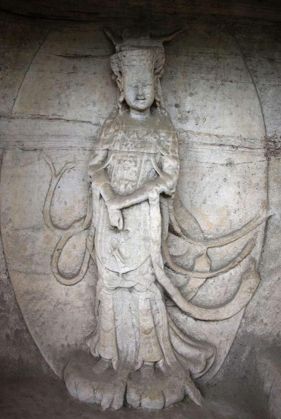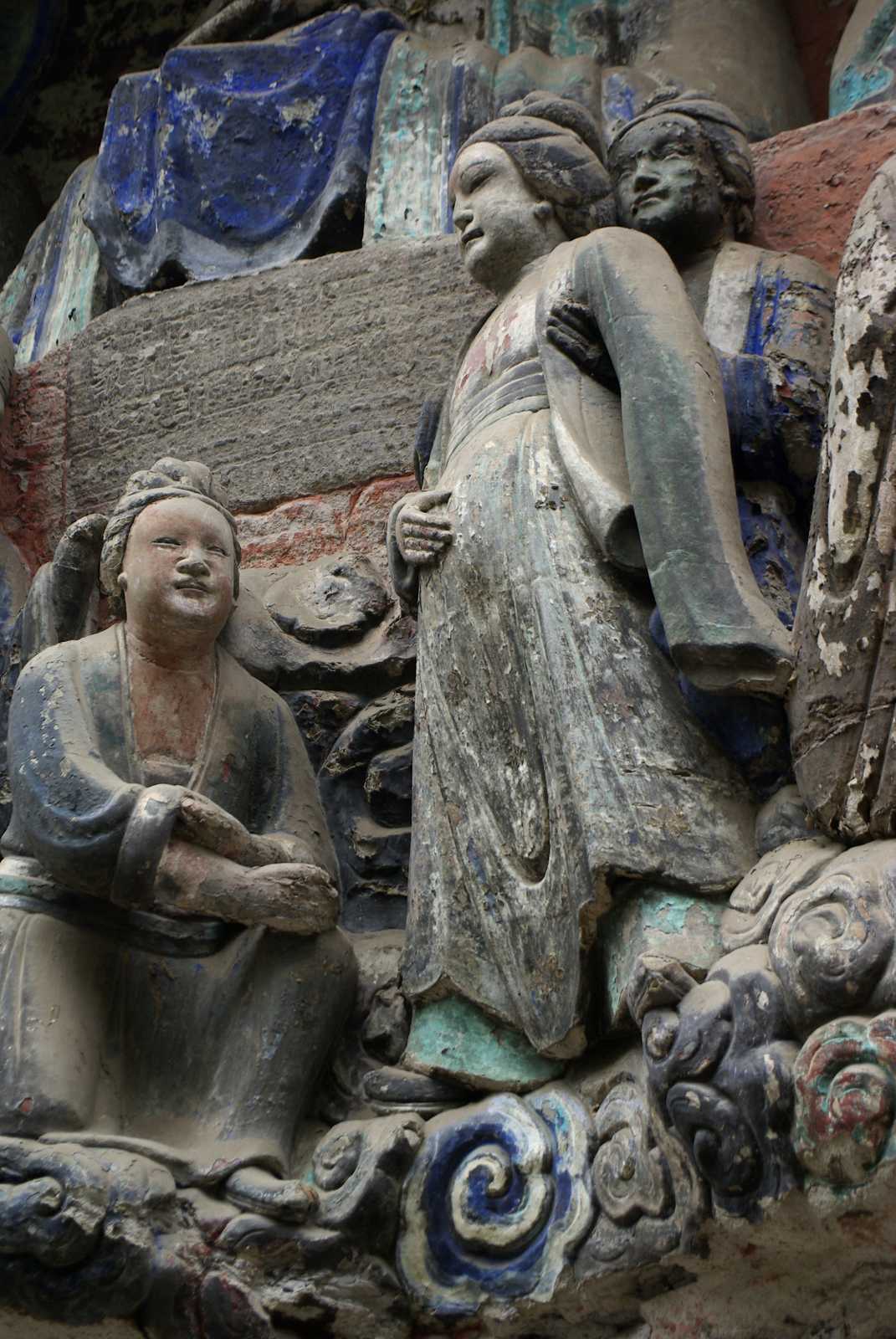 寶頂山石刻還有一些有趣的現象,釋迦牟尼和太上老君、孔子共坐一龕,傳說中的閻羅王,雷公電母、千里眼、順風耳的造像也混于其中。充分顯示了當時社會“儒、道、佛”三教相互融合的背景。寶頂山石窟最著名的千手千眼觀音造型由于正在修繕之中,無法得見全貌,成為此行中的唯一遺憾。