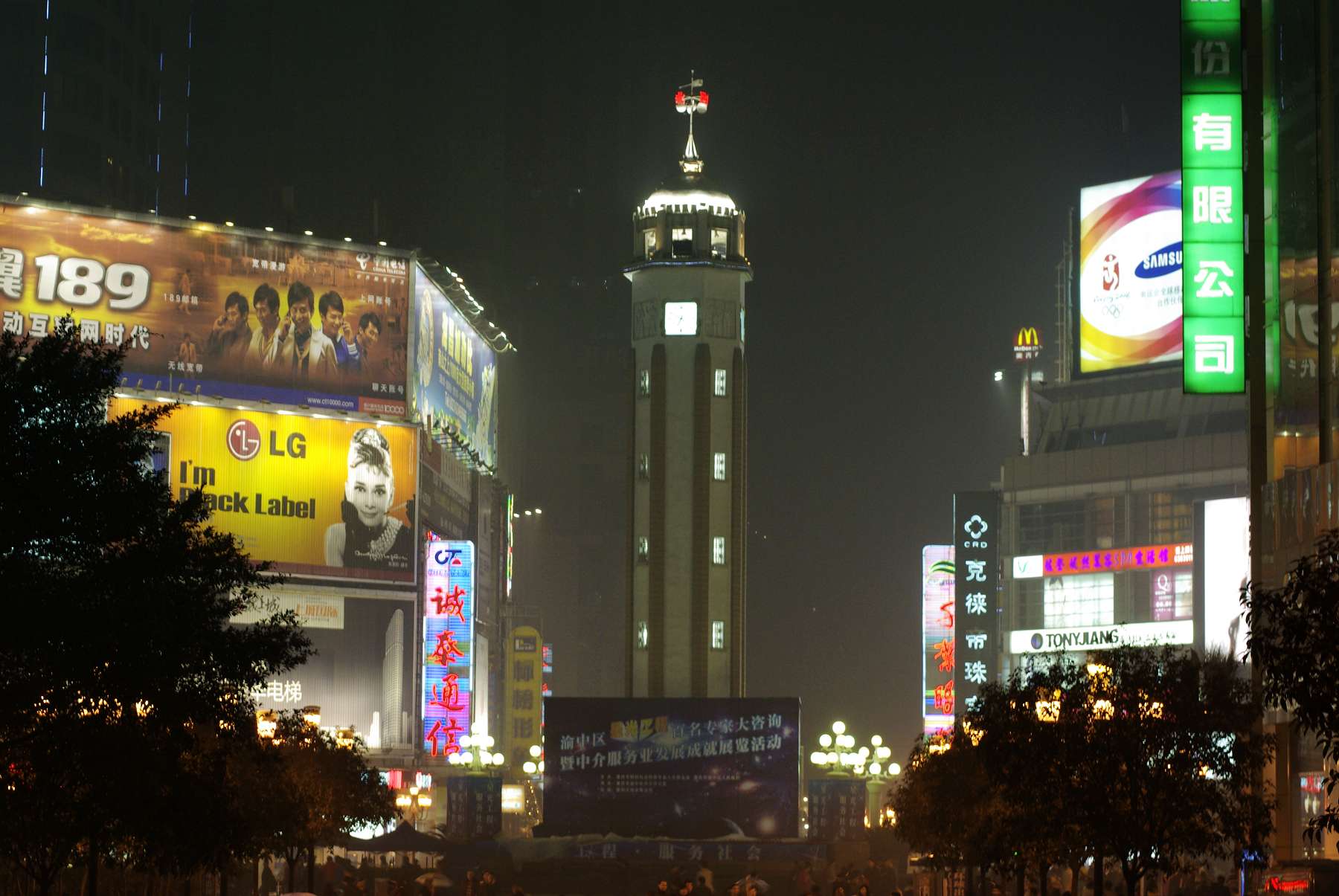 下午13:30分的飛機16:00左右到達了重慶江北國際機場。一下飛機就領教了中國“霧都”這個稱號的利害,城市的高樓大廈若隱若現在濃霧之中,后來的幾天行程中在薄霧籠罩下的“霧都”始終未向我們袒露其魅力的容顏。跟隨機場巴士(重慶機場巴士不像上海分那么多條線路,去往市區的巴士只有一條線路,全程停靠三站,終點美專校街)在車上小睡了一覺(行程約50分鐘,因為進入市區后路比較堵,票價16元一人。)天快全黑的時候,車終于到站了,感謝偉大的LP,她為我們訂的七天連鎖酒店正好就在機場巴士站旁,萬分喜悅的CHECK IN后進房休息(本人嚴重推薦各位朋友去重慶旅游的話可以考慮這個酒店,實在是非常方便,價格也便宜,一般的雙人房129,好一點大一點的149,不過要訂的人請先在七天連鎖的網站上注冊一下,只有通過網上訂才可以有優惠的價格,而且注冊了會員以后,每天可以在賓館領一盒牛奶,很不錯哦)。放下行囊后我們決定前往解放碑附近解決晚飯,順便領略一下重慶的夜色,酒店門口的出租很讓人討厭,他們除了機場外,短線一律不走(我們也終于領教了重慶司機大罷工的余威),沒辦法在酒店旁的車站坐了公交直達解放碑的(共四站路),解放碑的商業氛圍絲毫不會遜色給上海任何一個頂級商業圈,置身步行街上。要不是眼前矗立的城市標志,我還真有在南京路的感覺。想起一個朋友曾經說過,他買了幾十串缽缽雞,就在解放碑的臺階上坐著,一整天什么也不做,就是看來來往往的重慶美女,可見這里是美女出沒的主要地點。轉了一圈后我們決定前往網友們極力推薦的洪崖洞看看,洪崖洞依山而建面對嘉陵江上下共11層分多個商業街區,出租車將我們送到的是11樓所在的街區,下車時由于根本沒法見到整個建筑的全貌,還當被忽悠了呢,坐電梯直達了5樓餐飲街,販賣美食的商鋪一下子吸引了我們,在精挑細選了一番后,我們選了一家叫石海洞香的鋪子坐了下來,這家店的招牌菜是(紅橋豬兒粑和(宜賓燃面)。風卷殘云的大快朵頤一番,從嘉陵江一側的樓梯下到了一樓,洪崖洞的全貌終于一覽無遺了,傳統的吊角樓建筑與山體結合的渾然一體,整個洪崖洞的泛光照明與嘉陵江兩邊的燈火交相輝映。構成了山城獨特的美景,正巧有一艘豪華郵輪停靠在正對洪崖洞的江面上,船上燈火通明,甲板上正在進行歌舞表演,一派歌舞升平的景色,毫無金融危機的蹤影。狂拍了一通照片后,我們折返到5樓繼續逛街,整個5樓由餐飲、特色食品商店,明間藝人擺設的攤位組成。許多店鋪都有非常有特色,比如賣張飛牛肉的店鋪前站著一個黑臉大哥,拿著丈八蛇矛,非常的威武(可惜不買他家的牛肉你就別想照他的臉了)打糕店前,兩個伙計揮舞這木槌在砸著一堆原料,花生、麥芽、芝麻等材料在反復敲打后變成了美食,可惜我們還有大堆的行程要走,背著它們也是大累贅,本想最后一天會有時間在來一次的,沒想到這次錯失就真成了此行的一大遺憾。老街的盡頭是巴渝劇院,劇院的外墻由若干張巨大的重慶的老照片組成。非常有特色,重慶的歷史以這樣一種形式得以了保留,洪崖洞也就成為了重慶的一種標志。明天還要趕早去武隆,結束了參觀我們叫了一輛出租回酒店休息。順便贊一下重慶的出租車價,在幾個直轄市中真的算便宜啊,5元的起步價,所以之后的幾天我們四個幾乎就沒沒考慮過坐車,順便贊一句重慶出租司機的車技,在高低不平的街道上穿梭自如的這份能耐,實在讓人佩服,精彩還在后面,別走開哦。