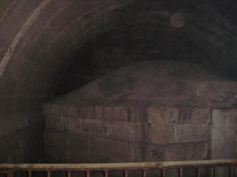 還是什么都看不見,我把數碼的閃光燈打開,舉起來就是一張,回放一看倒嚇了自己一跳:赫然一個大墓!雖然不太正,但肯定是巴蔓子墓。黑洞里仍然看不清,根據已拍的照片,估摸著調了調位置,又是一張、一張、一張……這時的眼睛已經基本適應黑洞了,大到可以看到高不及腰的攔桿和墓碑了。