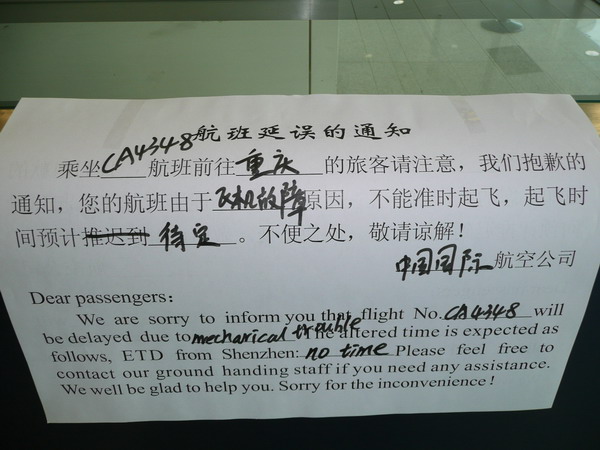 一到柜臺(tái)就被告知,航班因?yàn)闄C(jī)件故障,晚到。航班何時(shí)能起飛,請(qǐng)等待通知。
