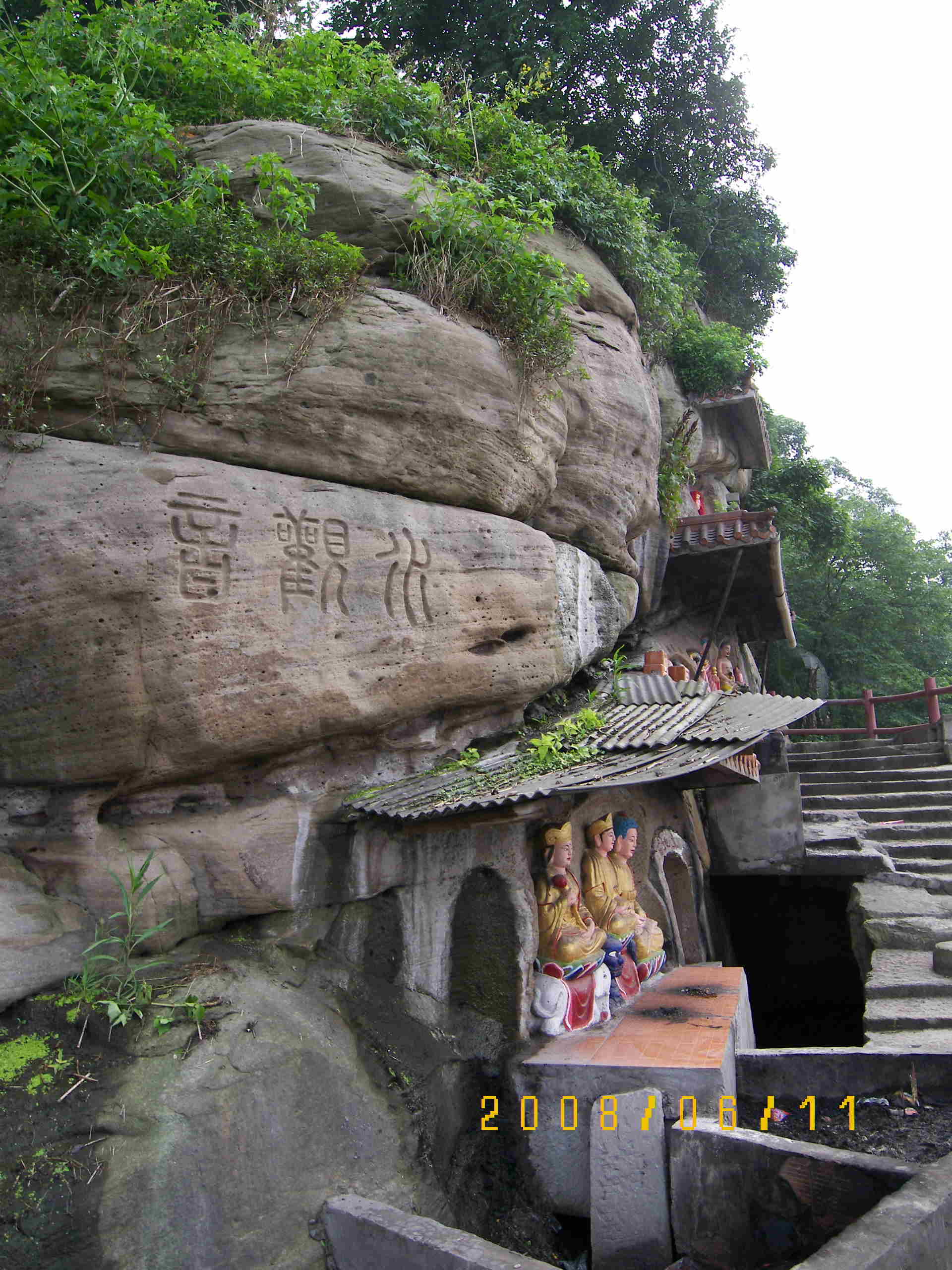 磁器口古鎮(原名白崖場),位于重慶城西14公里的嘉陵江畔。始于宋真宗咸平年間(公元998-1003年),在明朝成為繁華的商業碼頭,“白日里千人拱手,入夜來萬盞明燈”是其繁榮寫照。清朝初年,因生產青花磁,得名磁器口,古稱龍隱鎮,差不多有1800年的歷史了.15:00乘上467(1元),幾分鐘就到了.往前走一點左手邊就是大門口,最熱鬧的是入口處右側轉彎到江邊碼頭這一段,功略里記載的陳麻花、龍隱毛血旺、張飛牛肉等等.陳麻花總店排隊的人太多,不高興等了,形成明顯反差的旁邊幾家店幾乎是門可羅雀.我是先走了左轉彎的這條,明顯冷清多了,走到幸福街回轉,經過繁多的商家,從鳳凰閣茶樓這里走高路去水觀音.水觀音其實可以說是摩崖石刻(可能稍稍夸張了些,還有其他一些佛爺,看樣子是民間自發的.拍完在岸邊看看風景,這里時常可見寫生的人.之前是傾盆大雨,現在艷陽高照,昨天船上已經足夠日光浴了,今天就兔了吧.16:40看看功略上的美食指引,下到江邊走低路去吃飯.據說龍隱的不錯,不過小鍋35擔心太多,商量了一下,上了小份的,弄了份微辣的,感覺偏咸,味道還可以,雞雜就不肯加小份的了,此處攻略行不通了,呵呵.結帳26元,吃得肚膨氣脹,別的也裝不下了.回去的路上看到陳麻花人不多了,排隊買了半斤(5元).