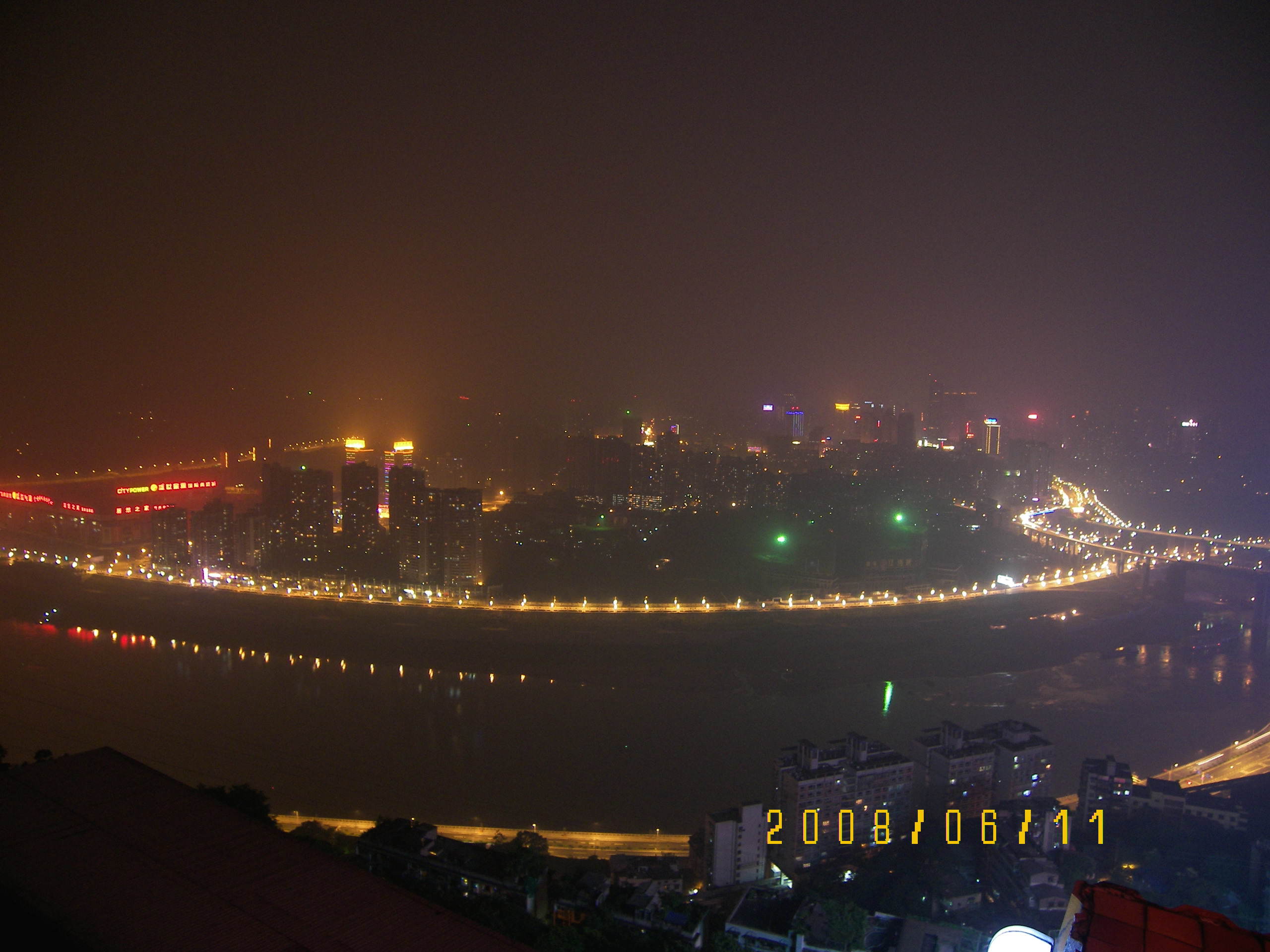 儂次走過厚慈街、守備街、花街子、解放西路到凱旋路乘電梯,在復旦中學旁邊,0.5元/次,似乎幾秒鐘就到了上面,繼續沿凱旋路走到德意世界,看到"大轟炸慘案遺址",右轉走一點就是解放碑步行街.重慶人似乎很愛熱鬧,解放碑基座四面圍坐了很多人.拍了幾張后回德意世界,從較場口E口乘輕軌去李子壩站(2元).出站前問工作人員,說晚上過去路不好找,建議我打車去,可是下到路邊,順方向一直沒車,只能逆方向,到鵝嶺公園門口打表7.7元,實收8元,說是慣例?不過態度還可以.下車進公園,沿右側道路去攬勝樓,稍爬了一些坡.到了攬勝樓,工作人員說晚上十點半關門,看看還有時間,抓緊上樓(門票5元).居高臨下,確實很漂亮,還有南濱路據說也不錯.