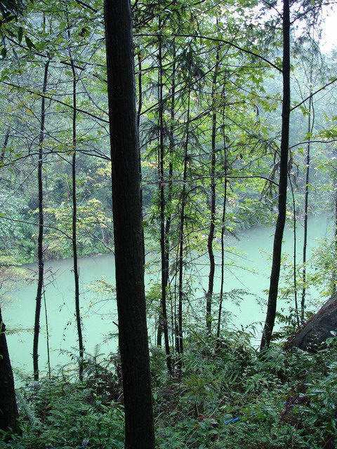 剛才是從車里往外看,現在身處在這一切景物里了。毛骨悚然的感覺漸漸消失,我們將自己的身心融入到縉云山的靈氣之中。終于感受到了她獨特的美。這山、這竹林、這樹木似乎也明白了我們。濃霧漸漸淡了,大山那閃著光的翠綠呈現在了眼前,我們開始慶幸今天這山里的人煙稀少,越走景色越發怡人。我們,繼續,瘋狂拍照。山路上的石頭是濕潤的亮亮的,其余都是植物,各種植物,除了竹子我跟本叫不出它們名字。濃密,我保證在北京的朋友絕對不會明白什么是真正的濃密的樹,什么是靈秀的山。有人會說,靈秀的山是要有水的。沒錯,我們如約來到了山路旁的“黛湖”,雖然濃霧已經散去,但碧綠的湖面上依然云霧繚繞,那云是舞動的。我們還是瘋狂照相。但任憑我們怎么拍,相片里的黛湖身臨其境相比,都是呆板的,平庸的,甚至是傻乎乎的(還是來親眼看看吧)。于是,我們收起相機,靜靜看著,看山映在水里,水滋潤著山,云霧從她們中間飄過。不騙你,當時,我想起了九寨溝。