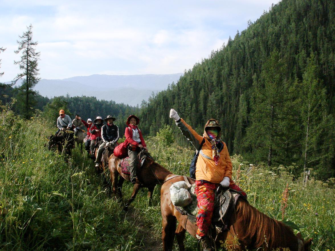 幸虧我自己還能在馬背上照相,才留下了這些珍貴的照片,現(xiàn)在讓您看一看吧,你在馬背上真是英姿颯爽呢。我們兩個(gè),在大土臺(tái)那里,哈哈,小花他們都不敢動(dòng),我們兩個(gè)就裝昏走到大土臺(tái)上去了,到了那里發(fā)現(xiàn)風(fēng)景好極了,簡(jiǎn)直把我們倆高興瘋了,你像領(lǐng)袖一樣抬手向禾木的大地和早晨問好,臉上洋溢著快樂的光彩;還有拿杵拐的那張,在那個(gè)地方您給我也來了一張,我們背后是喀納斯山特有的那種金色長坡,還有我們的那十匹馬的在早晨陽光下的馬屁股!