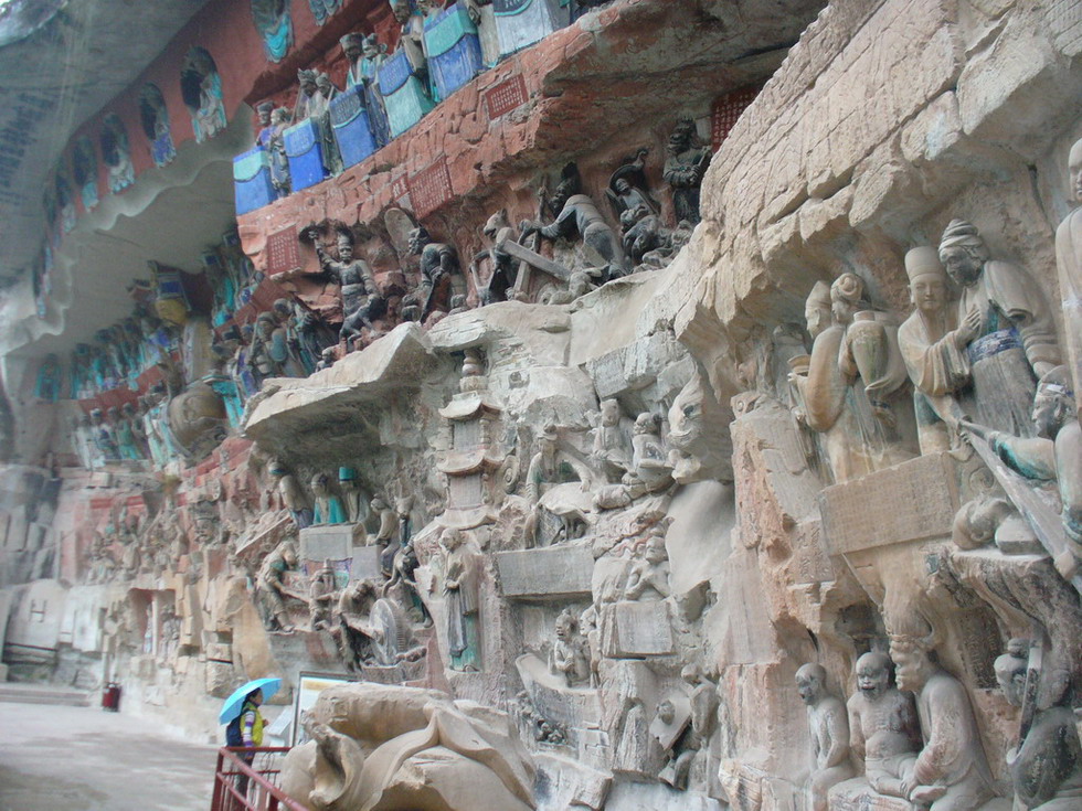 進門就在山頭上,右側下方就是寶頂山石刻,這里是大足石刻的精華,但是長也不過500米,蜿蜒在右側的山腰,繞一圈從左側回來。其實很小的山谷,山谷中間樹木蔥翠,竹林搖曳,遠遠的看見了山腰挖掘出來的石像和走廊。中午時分,人不是很多。時有時無的細雨很是麻煩,只好撐著傘邊挪步前行。