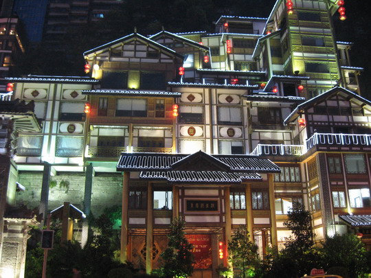 洪崖洞是片仿古的建筑,倚山臨江,層層聳疊,別具風情的吊角樓群十分壯觀,里面除了酒店,還有無數的小吃餐飲商店,是小天鵝集團出資建造的,也成了重慶的一大景觀了,就象上海的城隍廟。最奇特的是這里的地形,我從江邊的最低層進去,坐了電梯到四樓,出來就是一條仿古街,換部電梯再上,到了頂層出來,門口居然又是一條車水馬龍的路。