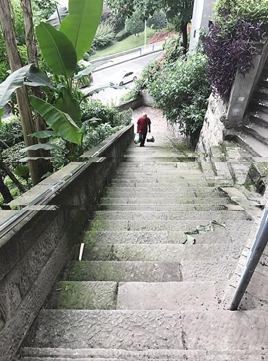 由于地形因素,步道沿著嘉陵橋東村的山腰往嘉陵江方向延伸。記者是第一次走進嘉陵橋東村,沒想到嘉陵橋橋頭的山堡上還有不少居民戶。初入步道,長著青苔的石板一看就有些年月了,但是步道還比較寬敞。步道旁的樹,枝繁葉茂,冠蓋如傘,初夏的綠蔭把步道裝點成了“空中綠廊”。
