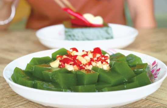 神豆腐:是一種名為臭葉黃荊的植物葉汁堿制而成,色綠、爽滑、脆嫩,清香盈口,滋味上佳。